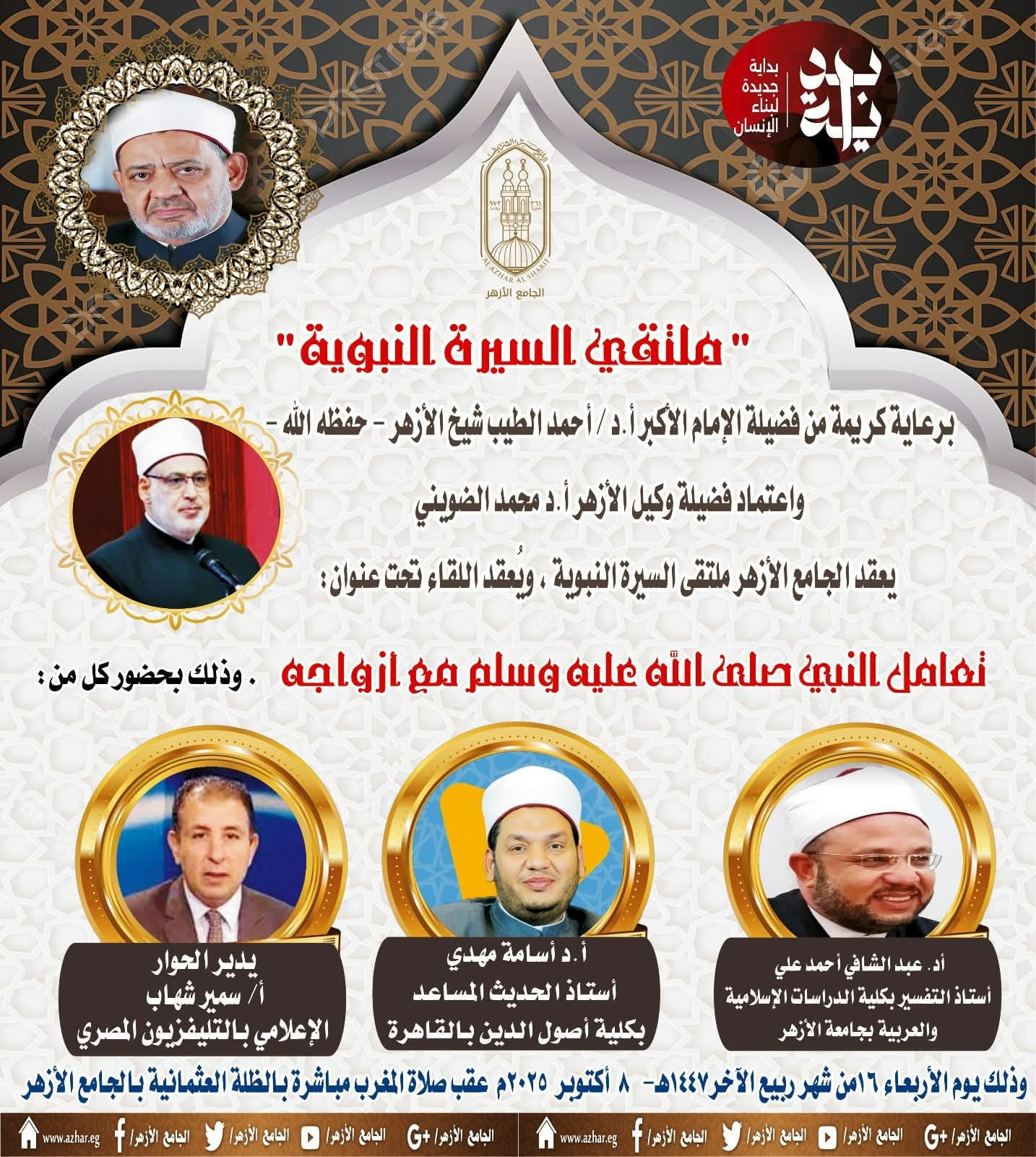 برعاية كريمة من فضيلة الإمام الأكبر أ.د أحمد الطيب، شيخ الأزهر، وبتوجيهات فضيلة أ.د محمد الضويني، وكيل الأزهر الشريف يعقد الجامع الأزهر غداً ملتقى السيرة النبوية الحادي والثلاثون ، والذي يناقش على مائدته: "تعامل النبي ﷺ مع أزواجه"