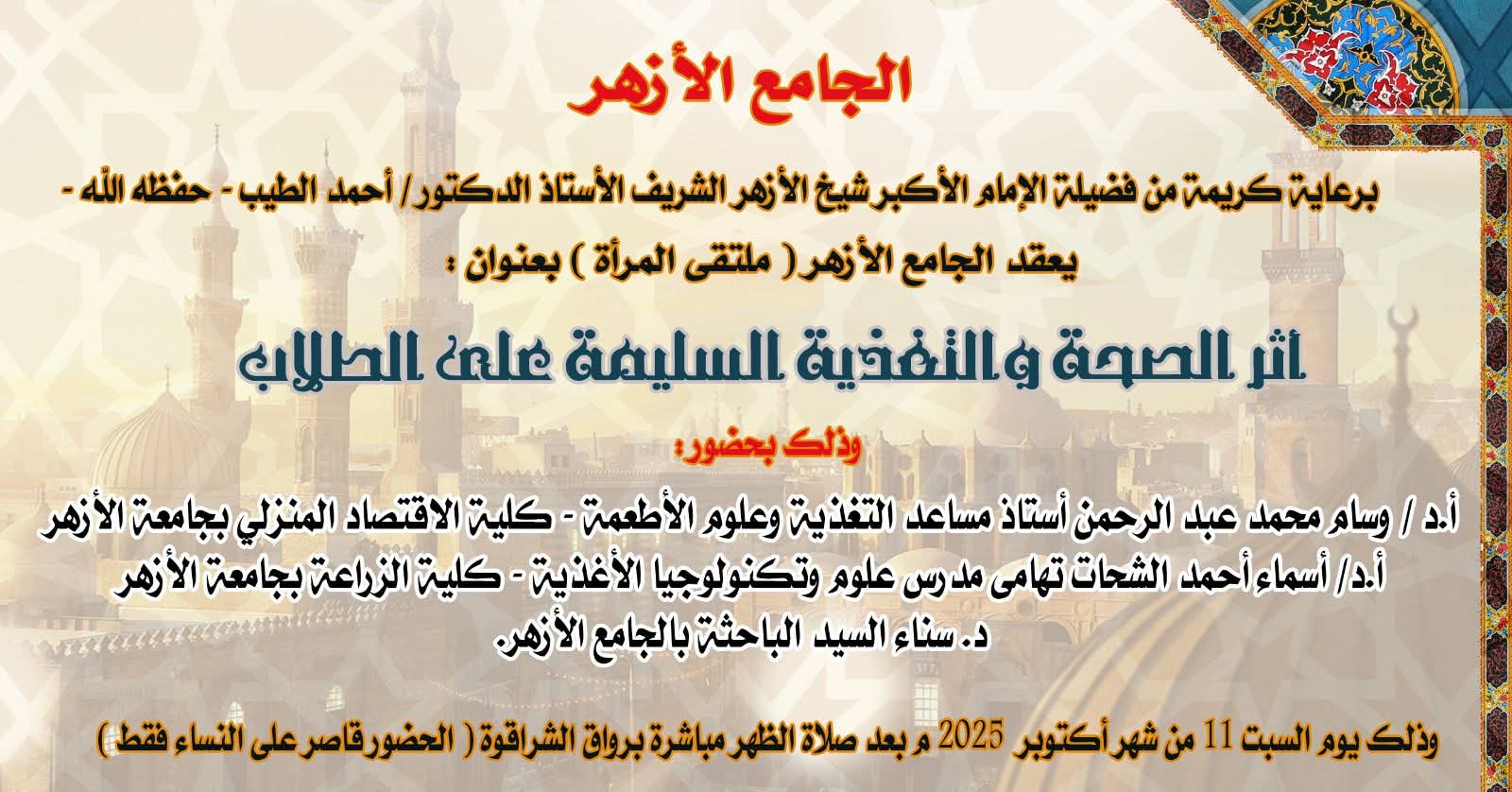 يعقد الجامع الأزهر الشريف السبت المقبل حلقة جديدة من الموسم السابع والعشرين من البرامج الموجهة للمرأة، تحت عنوان "العام الدراسي الجديد: آمال وتطلعات"، وذلك برعاية كريمة من فضيلة الإمام الأكبر الدكتور أحمد الطيب، شيخ الأزهر الشريف، وبتوجيهات الدكتور محمد الضويني وكيل الأزهر، وبإشراف الدكتور عبد المنعم فؤاد، المشرف العام على الأنشطة العلمية للرواق الأزهري، والدكتور هاني عودة، مدير عام الجامع الأزهر.