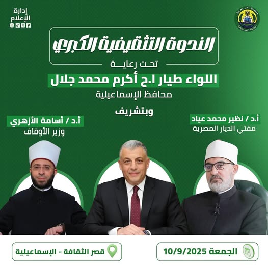 توجه اللواء طيار ا.ح أكرم محمد جلال محافظ الإسماعيلية بدعوة جموع المواطنين لحضور "الندوة التثقيفية الكبري "بحضور وزير الأوقاف الاستاذ الدكتور أسامة الأزهري و فضيلة مفتي الديار المصرية الدكتور نظير عياد و لفيف من الرموز المصرية في كافة المجالات.