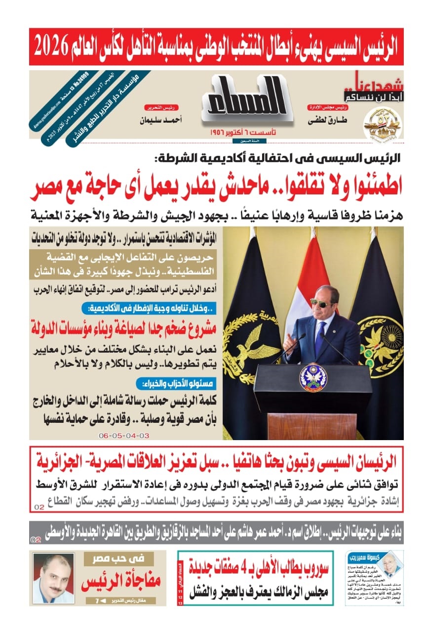 ** وعلي صفحات" المساء الرياضي " تقرأ :