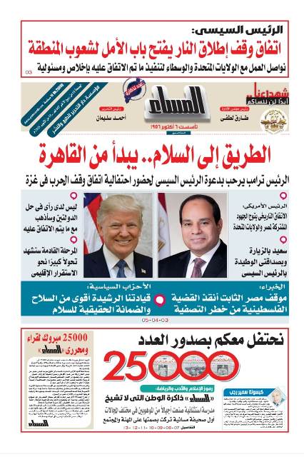 ★★ ننشر ملفا خاصا بمناسبة صدور العدد ٢٥٠٠٠ من المساء " حيث أكد الخبراء والنجوم أنها أعرق الصحف المسائية في الشرق الأوسط.. وأن الصحيفة تستكمل مشوارها في دعم الوطن والمواطن.. وأنها صاحبة تاريخ صحفي عريق وأفضال علي كبار الكتاب والشعراء والرياضيين وغيرهم حيث اشتهرت الجريدة باحتضان المواهب في مختلف المجالات.