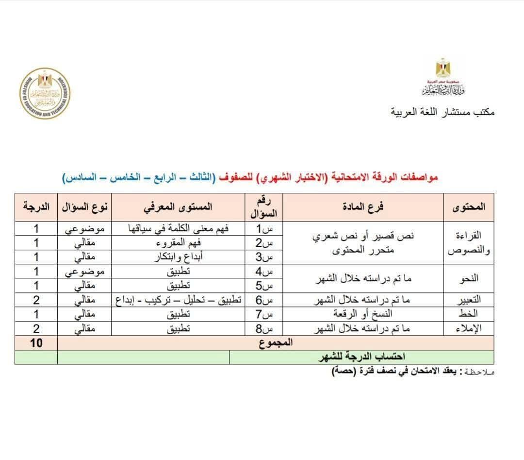 أعلنت وزارة التربية والتعليم والتعليم الفني، مواصفات امتحان مادة اللغة العربية شهر أكتوبر 2025 لطلاب الثالث والرابع والخامس والسادس الابتدائي، المقرر عقدها نهاية الشهر الجاري.