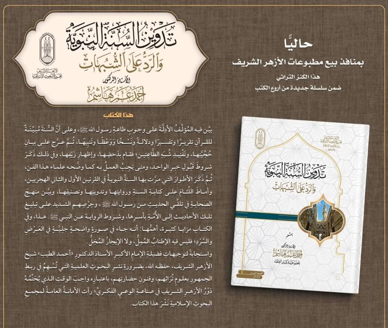 بيَّن فيه المُؤلِّفُ أ.د. أحمد عمر هاشم، الأَدِلَّةَ على وجوبِ طاعةِ رسول الله ﷺ، وعلى أنَّ السُّنةَ مُبـيِّـنَـةٌ للقرآنِ تقريرًا وتفسيرًا ودلالةً ونَسْخًا وَوَعْظًا وتَنبِيهًا، ثُمَّ عرَّج على بيانِ حُجِّيَّتِها، وتَفْنِيدِ شُبَهِ الطَّاعِنين؛ فقام بدَحضِها، وإظهارِ زَيْفِها، وفي ذلك ذَكَرَ شروطَ قَبُولِ خبرِ الواحد، ومتى يَجِبُ العملُ به كما وضَّحه علماء هذا الفن، ثُمَّ ذَكَرَ الأطوارَ التي مرَّت بها السُّنةُ النبويةُ في القرنين الأول والثاني الهجريين، وأماطَ اللِّثامَ على كتابةِ السُّنةِ وروايتِها وتدوينِها وتصنيفِها، وبيَّن منهجَ الصحابةِ في تلقِّي الحديثِ من رسول الله ﷺ ، وحِرْصِهم الشديد على تبليغ تلك الأحاديث إلى الأُمَّةِ بأسْرِها، وشروط الرواية عن النبي ﷺ، وفي الكتاب مزايا كثيرة؛ أهمُّها: أنه جاء في صورةٍ واضحةٍ جلِـيَّـةٍ في العَرْضِ والسَّرْدِ؛ فليس فيه الإطنابُ المُمِلُّ، ولا الإيجازُ المُخِلُّ.