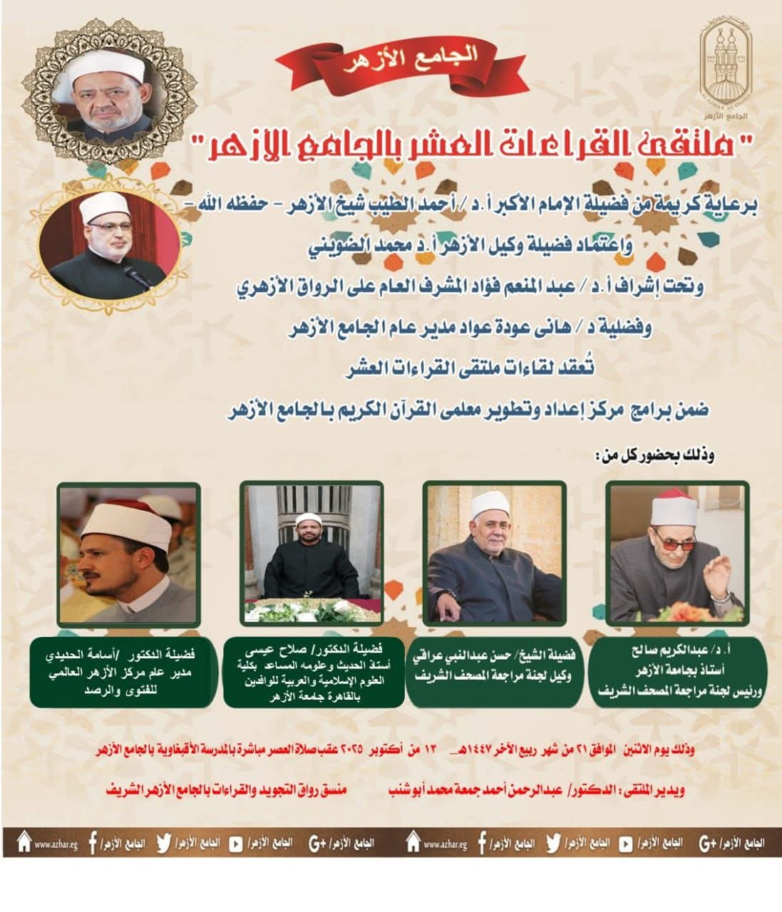 وصرح أ.د عبد المنعم فؤاد المشرف العام على الأنشطة العلمية للرواق الأزهري بالجامع الأزهر، أن هذا البرنامج يأتي ضمن سلسلة من الأنشطة والبرامج التي ينظمها مركز إعداد وتطوير معلمي القرآن الكريم بالجامع الأزهر، ويهدف إلى قراءة القرآن الكريم كاملاً بالقراءات الثلاثة المتممة للعشر، بواقع نصف جزء يومياً، مع تقديم شرح مفصل للتلاوة وتعريف بأصول القراء ومذاهبهم، كما سيتناول الملتقى التنبيه على الكلمات الفرشية المختلف فيها بين القراء، مما يسهم في تعزيز الفهم العميق للقراءات العشر المتواترة ورفع مستوى التلاوة بين المشاركين.