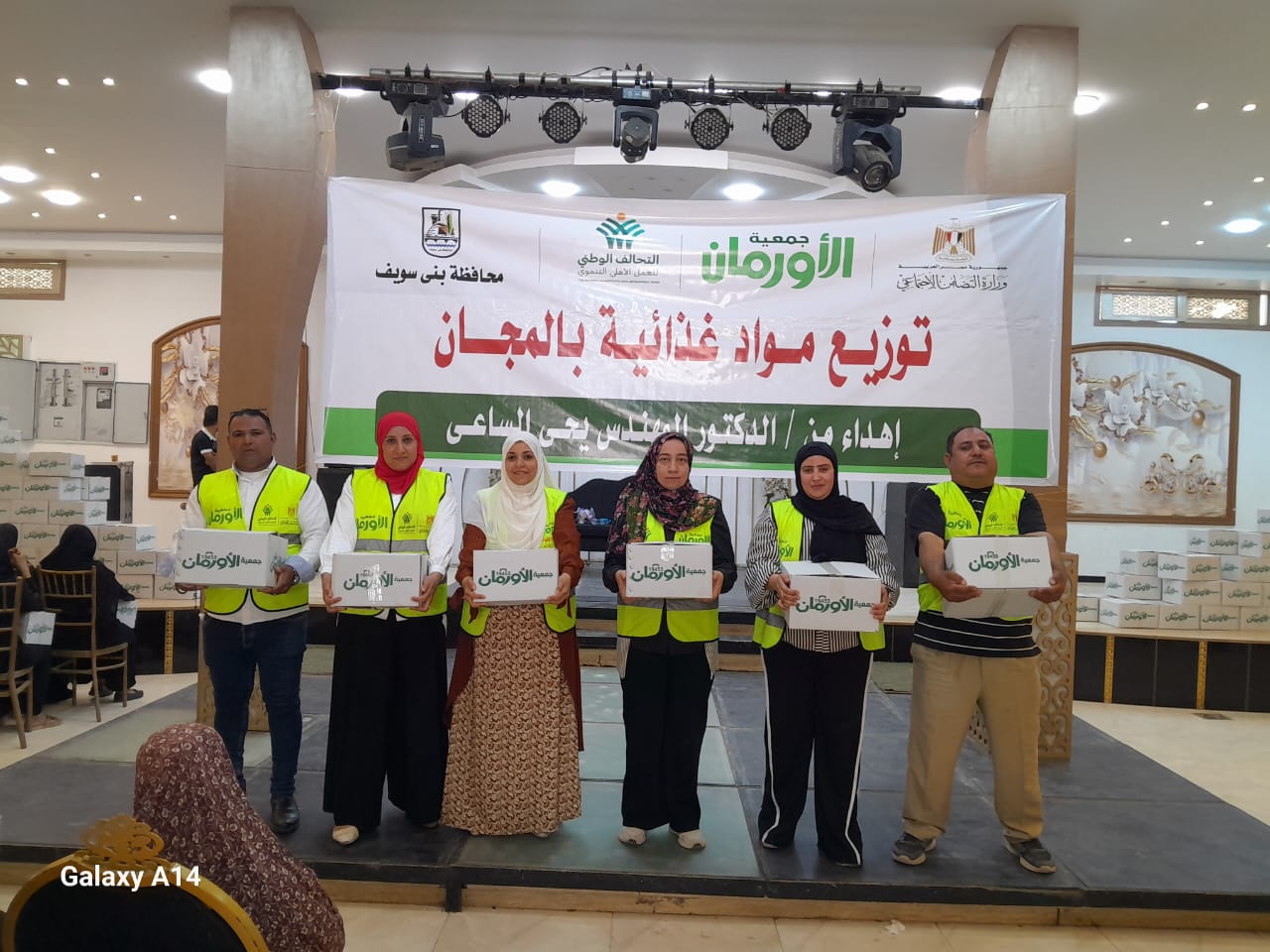 ة الأورمان فى توزيع (650) كرتونة مواد غذائية على 650 اسرة ضمن الأسر الاولى بالرعاية بقرى كفردرويش وزرابى الحيبة والقضابي بمركز الفشن فى محافظة بني سويف.