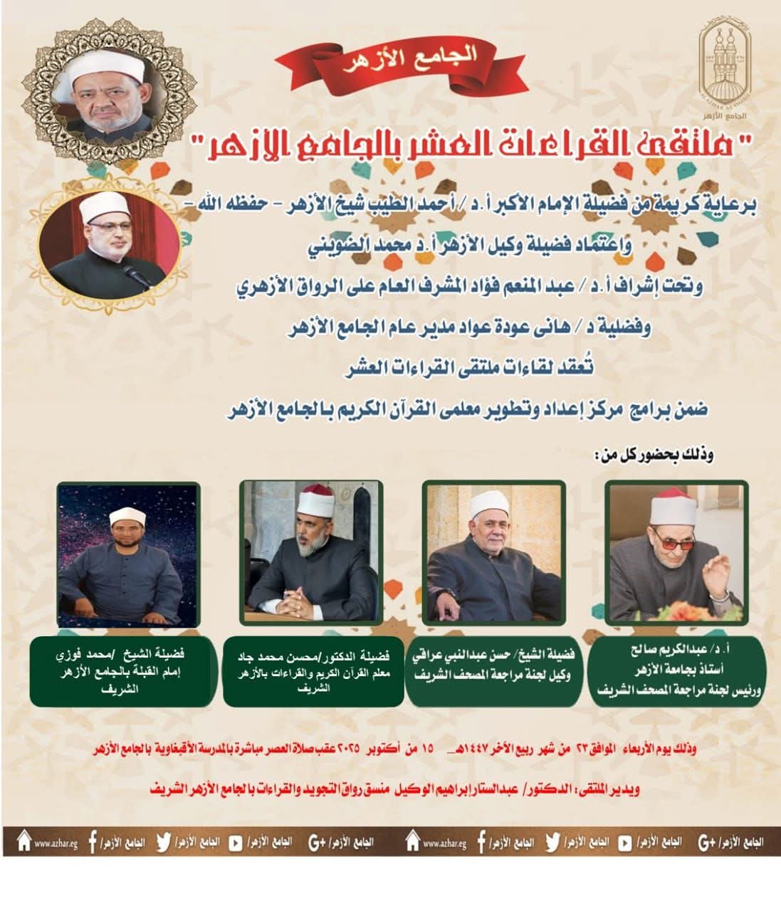 وصرح أ.د عبد المنعم فؤاد المشرف العام على الأنشطة العلمية للرواق الأزهري بالجامع الأزهر، أن هذا البرنامج يأتي ضمن سلسلة من الأنشطة والبرامج التي ينظمها مركز إعداد وتطوير معلمي القرآن الكريم بالجامع الأزهر، ويهدف إلى قراءة القرآن الكريم كاملاً بالقراءات الثلاثة المتممة للعشر، بواقع نصف جزء يومياً، مع تقديم شرح مفصل للتلاوة وتعريف بأصول القراء ومذاهبهم، كما سيتناول الملتقى التنبيه على الكلمات الفرشية المختلف فيها بين القراء، مما يسهم في تعزيز الفهم العميق للقراءات العشر المتواترة ورفع مستوى التلاوة بين المشاركين.
