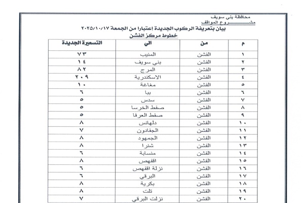 اعتمد الدكتور محمد هاني غنيم محافظ بني سويف التعريفة الجديدة للمواصلات الداخلية والخارجية لسيارات الأجرة والسرفيس والتاكسي داخل المحافظة وبين مراكزها الإدارية، وكذلك بين بني سويف والمحافظات الأخرى، وذلك عقب قرار الحكومة بتحريك أسعار المنتجات البترولية اعتبارًا من السادسة من صباح اليوم الجمعة 17 أكتوبر 2025، وما تضمنه القرار من تثبيت الأسعار داخل السوق المحلي لمدة عام كامل كحد أدنى.