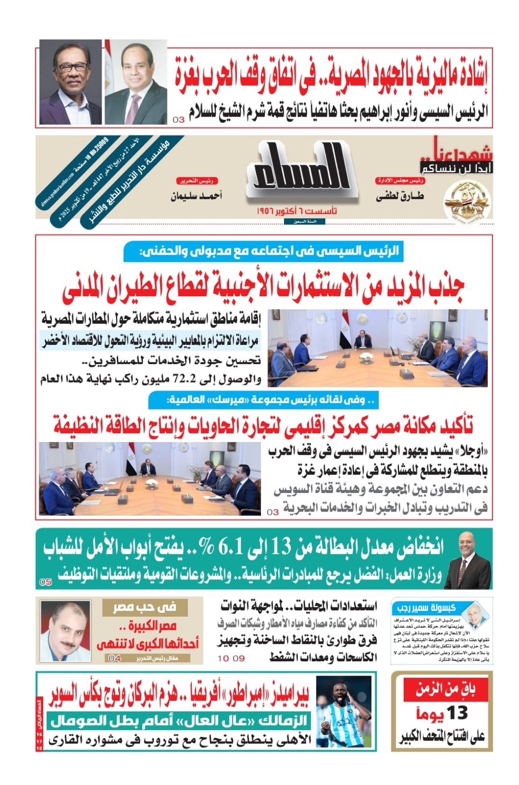 ** ونقرأ مقال "في حب مصر " لرئيس التحرير الكاتب الصحفي أحمد سليمان تحت عنوان "مصر الكبيرة .. أحداثها الكبرى لا تنتهى ".. نوه فيه إلي أن أنظار شعوب الأرض تتجه نحو مصر مرة أخرى خلال أيام لمتابعة افتتاح المتحف الكبير.. وطالب بحملات تنشيطية فى الداخل والخارج للترويج لهذا الحدث الأسطورى المبهر.
