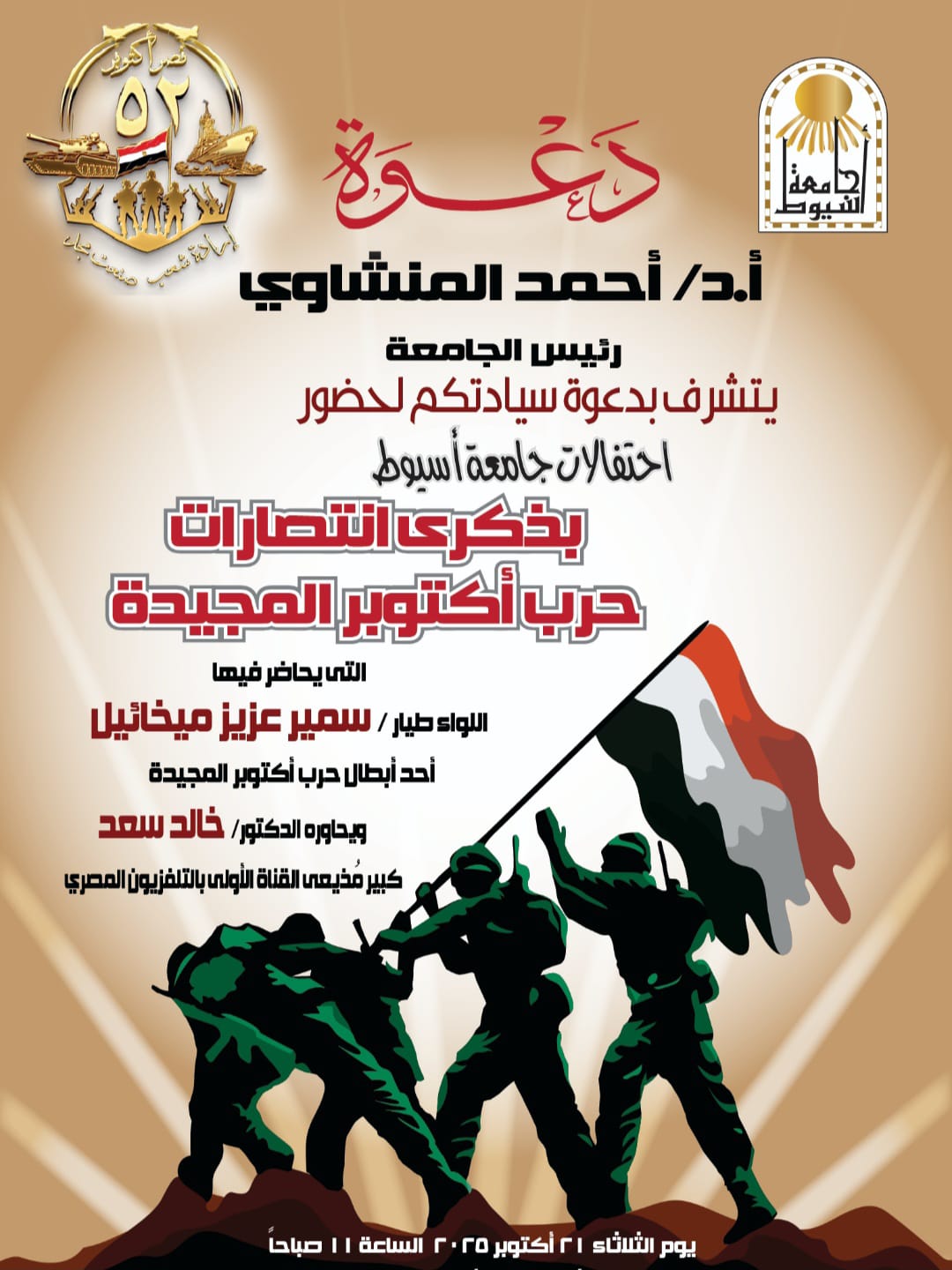 تشهد جامعة أسيوط، يوم الثلاثاء الموافق 21 أكتوبر 2025، احتفالية كبرى بمناسبة ذكرى انتصارات حرب أكتوبر المجيدة، وذلك تحت رعاية الدكتور أحمد المنشاوي، رئيس الجامعة، وبحضور اللواء طيار سمير عزيز ميخائيل أحد أبطال حرب أكتوبر المجيدة، وذلك بقاعة الدكتور محمد رأفت بالمبنى الإداري للجامعة في تمام الساعة الحادية عشرة صباحًا.