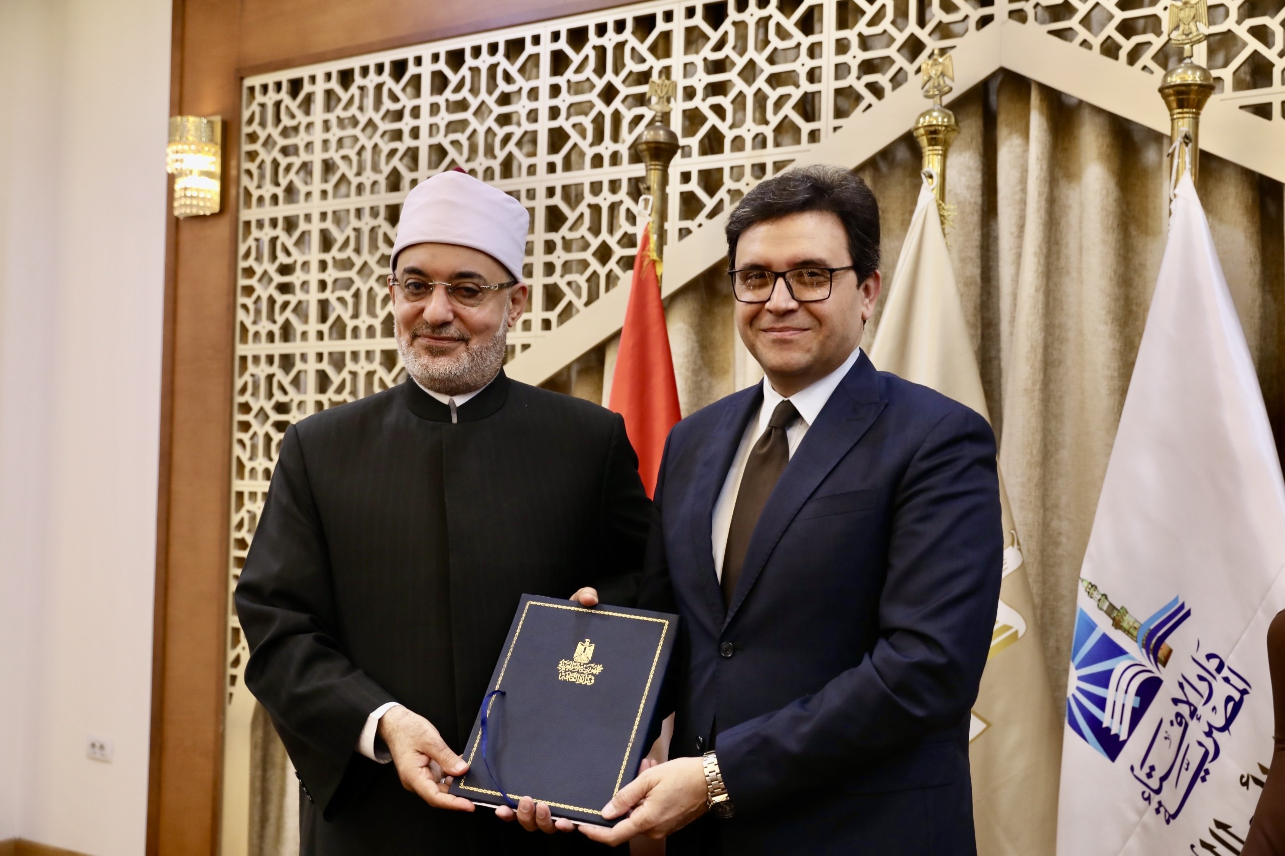 استقبل فضيلة أ.د نظير محمد عياد، مفتي الجمهورية، رئيس الأمانة العامة لدور وهيئات الإفتاء في العالم، أ.د أحمد فؤاد هنو، وزير الثقافة، بمقر دار الإفتاء المصرية، حيث شهد الجانبان توقيع بروتوكول تعاون مشترك بين المؤسستين، في إطار رؤية الدولة لبناء الإنسان المصري وتعزيز منظومة الوعي والفكر الوسطي الرشيد