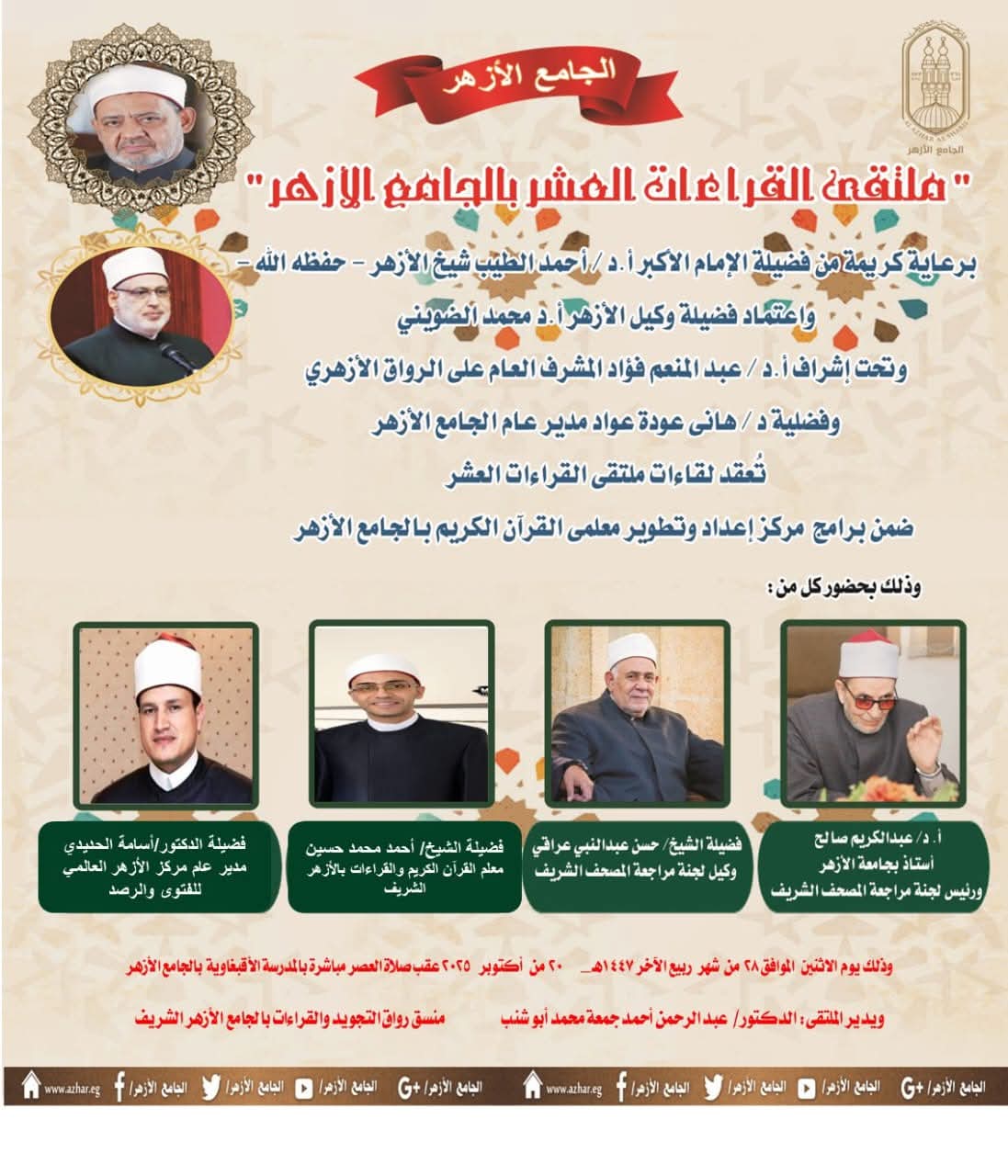 وصرح أ.د عبد المنعم فؤاد المشرف العام على الأنشطة العلمية للرواق الأزهري بالجامع الأزهر، أن هذا البرنامج يأتي ضمن سلسلة من الأنشطة والبرامج التي ينظمها مركز إعداد وتطوير معلمي القرآن الكريم بالجامع الأزهر، ويهدف إلى قراءة القرآن الكريم كاملاً بالقراءات الثلاثة المتممة للعشر، بواقع نصف جزء يومياً، مع تقديم شرح مفصل للتلاوة وتعريف بأصول القراء ومذاهبهم، كما سيتناول الملتقى التنبيه على الكلمات الفرشية المختلف فيها بين القراء، مما يسهم في تعزيز الفهم العميق للقراءات العشر المتواترة ورفع مستوى التلاوة بين المشاركين.