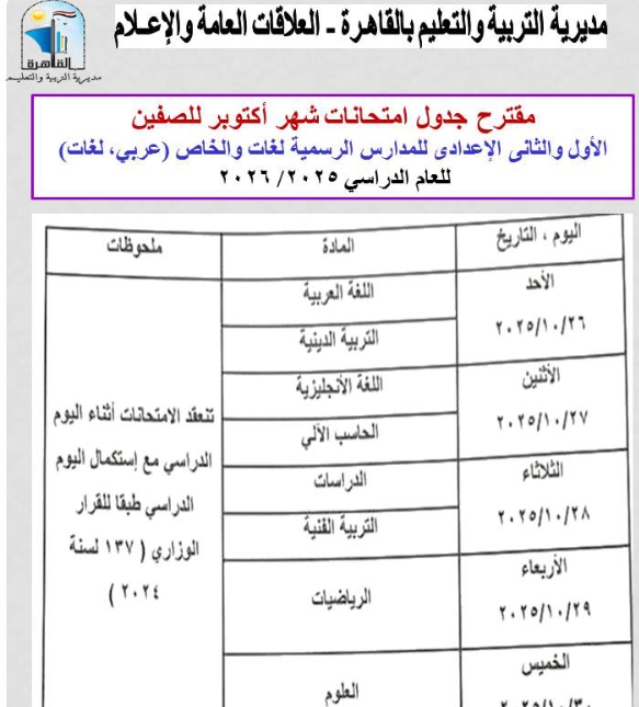 أعلنت مديرية التربية والتعليم بالقاهرة برعاية الدكتورة/ همت إسماعيل أبو كيلة عن مقترح جداول امتحانات شهر أكتوبر لمراحل النقل الثلاثة ( ابتدائي ـ إعدادى ـ ثانوى ) للعام الدراسي 2025/2026
