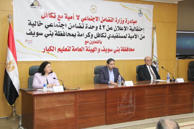 شهد بلال حبش، نائب محافظ بني سويف والمهندسة مارجريت صاروفيم، نائبة وزيرة التضامن الاجتماعي والمهندس رائد هيكل، رئيس الهيئة العامة لتعليم الكبار، احتفالية للإعلان عن 42 وحدة تضامن اجتماعي ببنى سويف خالية من الأمية من بين 67 وحدة على مستوى المحافظة، ضمن جهود تنفيذ مبادرة "لا أمية مع تكافل"، التي تُنفذ بالتعاون بين وزارة التضامن الاجتماعي، والهيئة العامة لتعليم الكبار، والمحافظة.