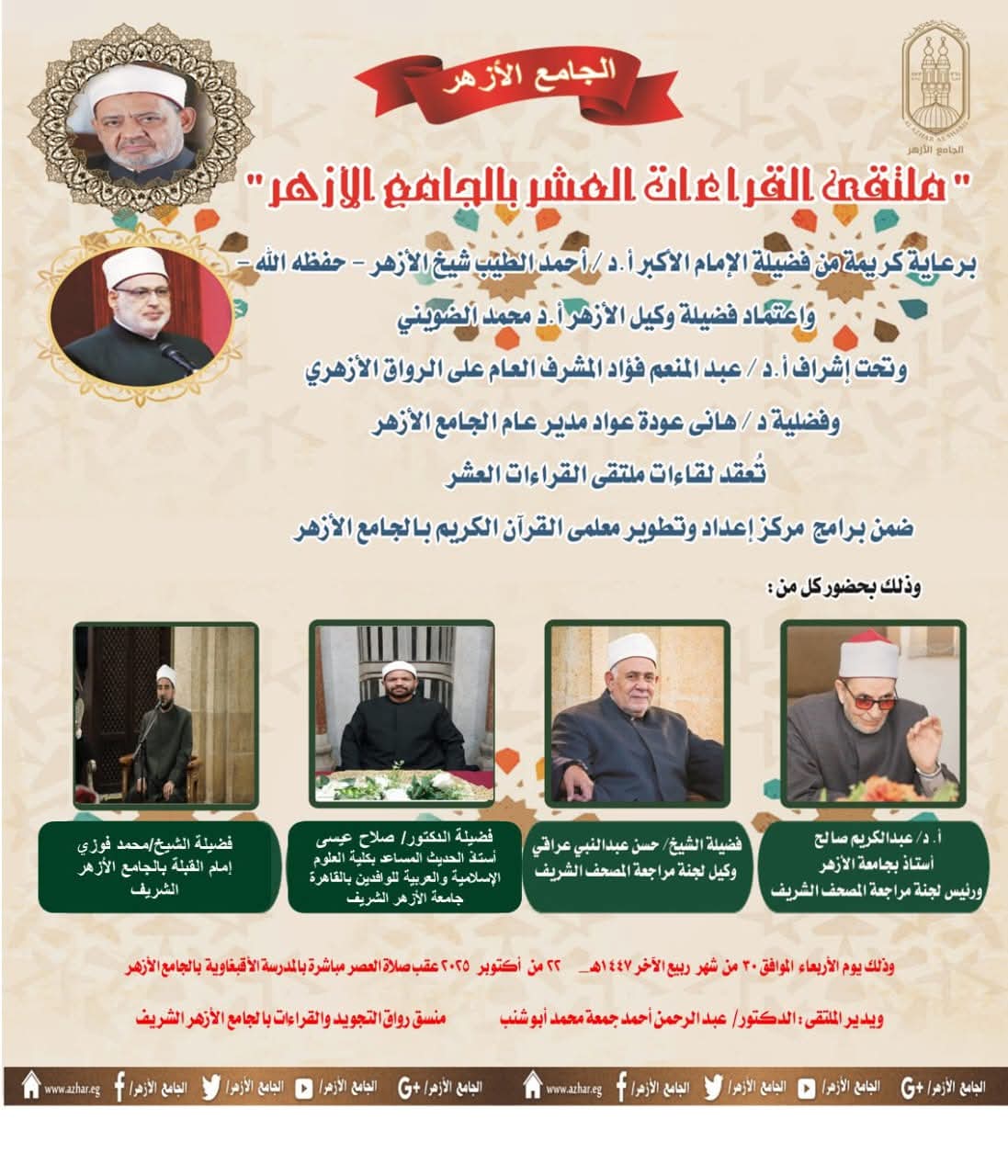 وصرح أ.د عبد المنعم فؤاد المشرف العام على الأنشطة العلمية للرواق الأزهري بالجامع الأزهر، أن هذا البرنامج يأتي ضمن سلسلة من الأنشطة والبرامج التي ينظمها مركز إعداد وتطوير معلمي القرآن الكريم بالجامع الأزهر، ويهدف إلى قراءة القرآن الكريم كاملاً بالقراءات الثلاثة المتممة للعشر، بواقع نصف جزء يومياً، مع تقديم شرح مفصل للتلاوة وتعريف بأصول القراء ومذاهبهم، كما سيتناول الملتقى التنبيه على الكلمات الفرشية المختلف فيها بين القراء، مما يسهم في تعزيز الفهم العميق للقراءات العشر المتواترة ورفع مستوى التلاوة بين المشاركين.