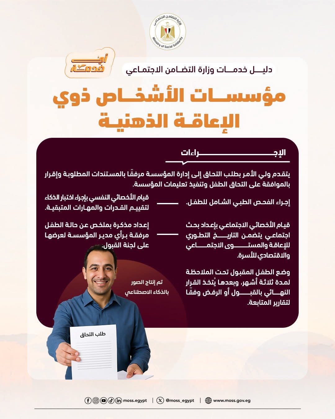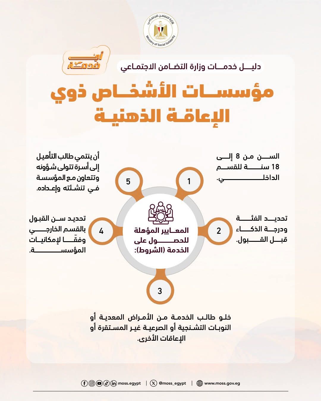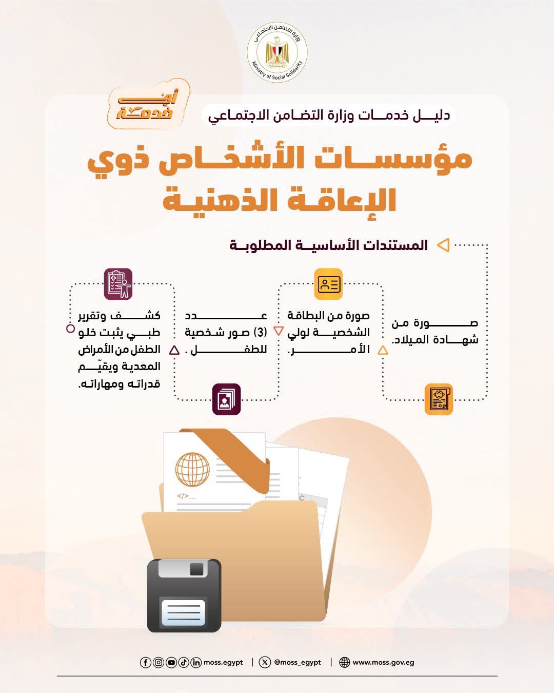 أطلقت وزارة التضامن الاجتماعي عبر صفحتها الرسمية على موقع التواصل الاجتماعي فيسبوك، إنفوجراف جديد ضمن سلسلة أي خدمة أوضحت فيه شروط وإجراءات الحصول على خدمات مؤسسات الأشخاص ذوي الإعاقة الذهنية، بهدف تسهيل الوصول إلى المعلومات وتعريف الأسر بالخطوات المطلوبة لقبول أبنائهم في تلك المؤسسات.