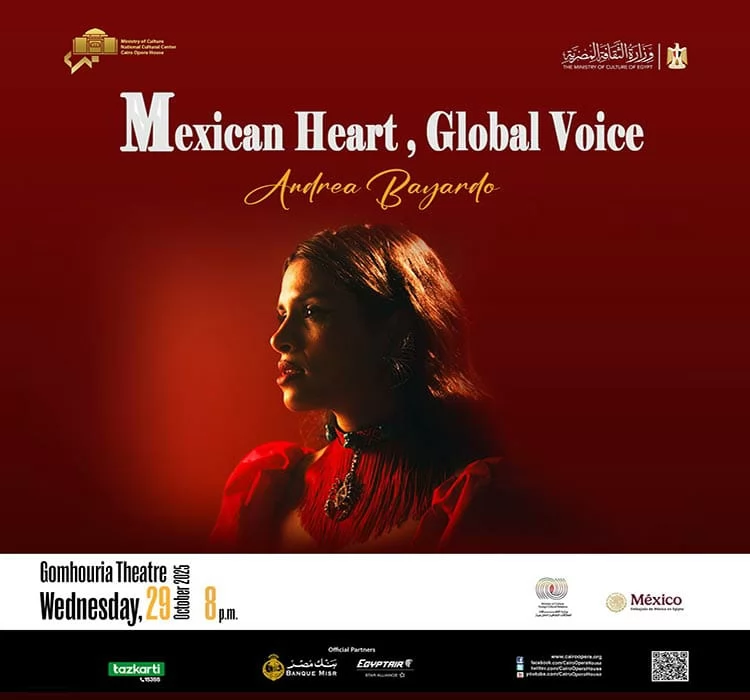 تستضيف دار الأوبرا المصرية برئاسة الدكتور علاء عبد السلام بالتعاون مع قطاع العلاقات الثقافية الخارجية وسفارة المكسيك بالقاهرة حفلا غنائياً بعنوان قلب مكسيكى.. وصوت عالمى " للمغنية أندريا باياردو وذلك في الثامنة مساء الأربعاء 29 اكتوبر على مسرح الجمهورية .