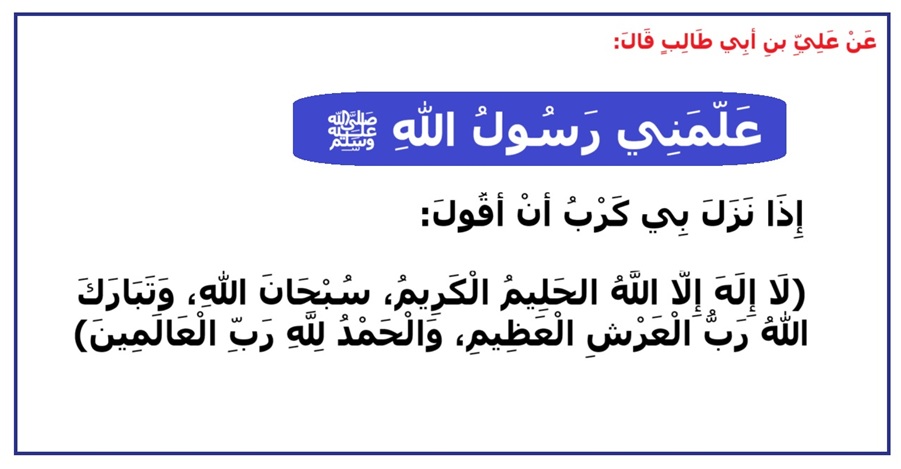 عَنْ عَلِيِّ بنِ أَبِي طَالِبٍ قَالَ: عَلَّمَنِي رَسُولُ اللهِ ﷺ إِذَا نَزَلَ بِي كَرْبُ أَنْ أَقُولَ: (لَا إِلَهَ إِلَّا اللَّهُ الحَلِيمُ الْكَرِيمُ، سُبْحَانَ اللهِ، وَتَبَارَكَ اللهُ رَبُّ الْعَرْشِ الْعَظِيمِ، وَالْحَمْدُ لِلَّهِ رَبِّ الْعَالَمِينَ) [صحيح، أخرجه: أحمد في مسنده].