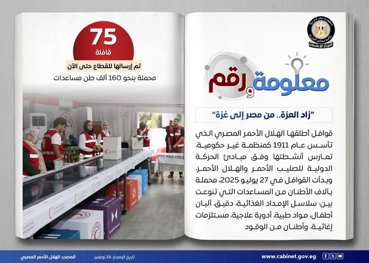 أطلق الهلال الأحمر المصري قافلة «زاد العزة .. من مصر إلى غزة» الـ75، حملت نحو 9900 طن من المساعدات الإنسانية العاجلة، شملت أكثر من 6100 طن سلال غذائية ودقيق، وما يزيد عن 2600 طن مستلزمات طبية وإغاثية ضرورية يحتاجها القطاع، ونحو 1100طن مواد بترولية. بالإضافة إلى احتياجات الشتاء الأساسية من بطاطين وملابس شتوية وخيام لإيواء المتضررين، ليصل إجمالي المساعدات المقدمة عبر القوافل نحو 160 ألف طن.