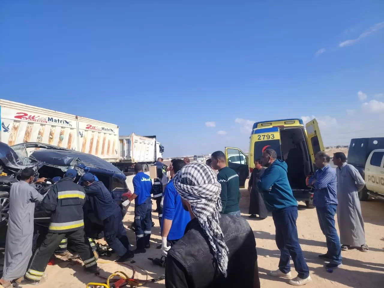 لقي ٢ مصرعهما واصيب اخرين باصابات خطيرة اثر اصطدام سيارة ملاكي بسيارة نقل مقطورة عند علامة الكيلو ١١٠ امام قرية سيدي شبيب بمركز الضبعة. nbsp;