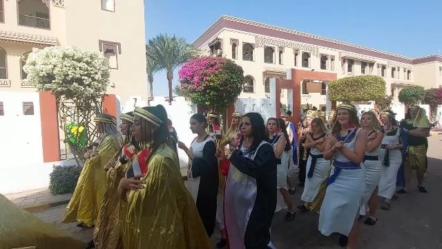 نظمت فنادق الغردقة اليوم الثلاثاء مسيرة فرعونية بمشاركة مئات السياح بالإضافة لعدد من العاملين بالقطاع السياحي، مرتدين الملابس الفرعونية ، وذلك لدعم افتتاح المتحف المصري الكبير حيث طافت المسيرة عدد من مناطق بالفنادق وصولا إلى الشاطئ.
