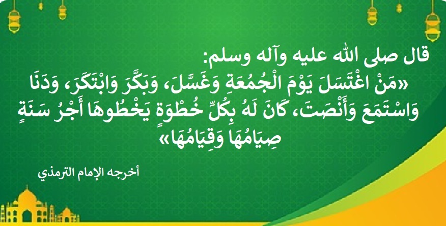 وقال صلى الله عليه وآله وسلم: «مَنْ اغْتَسَلَ يَوْمَ الْجُمُعَةِ وَغَسَّلَ، وَبَكَّرَ وَابْتَكَرَ، وَدَنَا وَاسْتَمَعَ وَأَنْصَتَ، كَانَ لَهُ بِكُلِّ خُطْوَةٍ يَخْطُوهَا أَجْرُ سَنَةٍ صِيَامُهَا وَقِيَامُهَا» أخرجه الإمام الترمذي في "سننه" من حديث أوسِ بن أوسٍ رضي الله عنه.