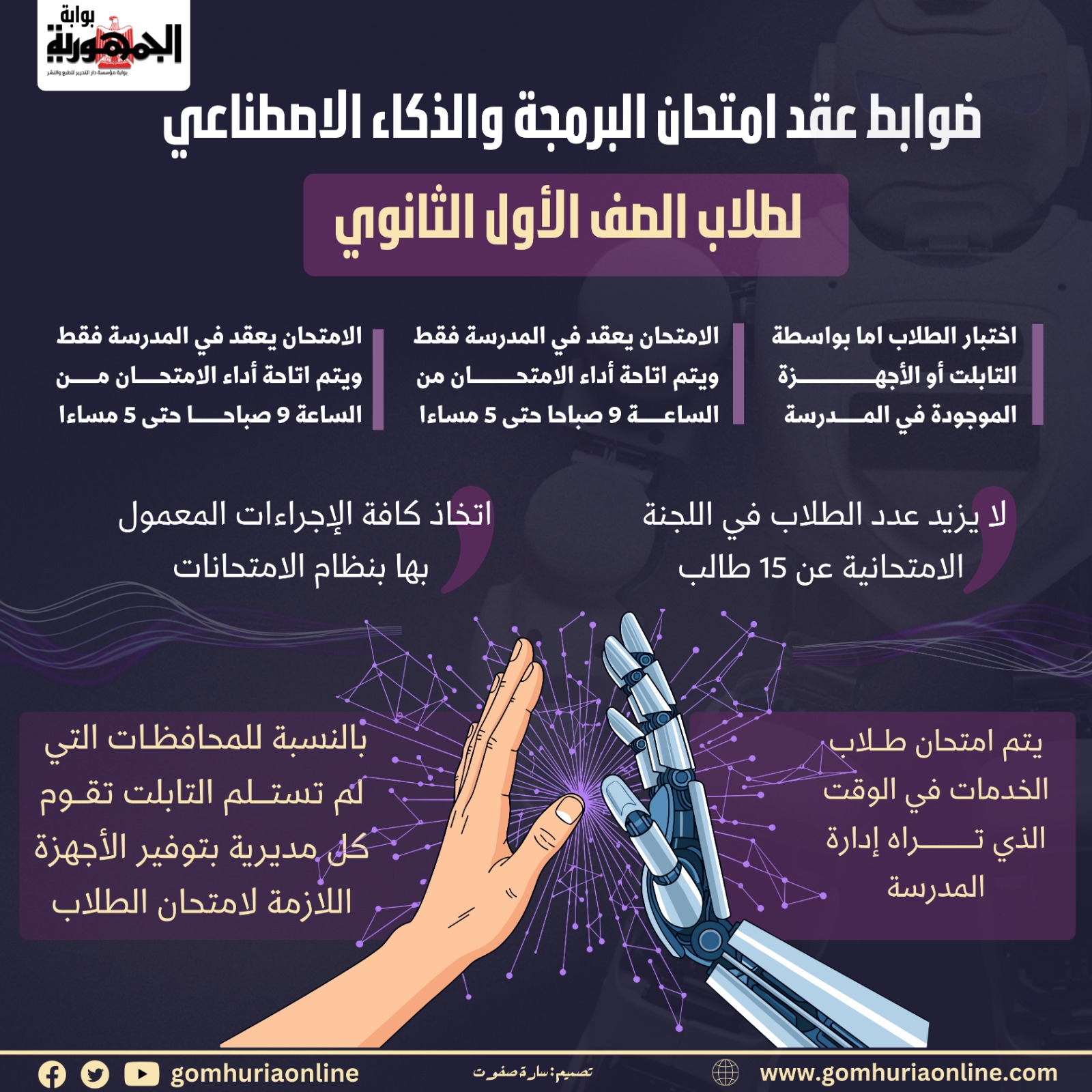 حددت وزارة التربية والتعليم والتعليم الفني جدول زمني يحدد موعد عقد امتحان البرمجة والذكاء الاصطناعي العملي لطلاب الصف الأول الثانوي عبر منصة كيريو في كل محافظة في مصر ، وتتمثل تفاصيل هذا الجدول الزمني فيما يلي :