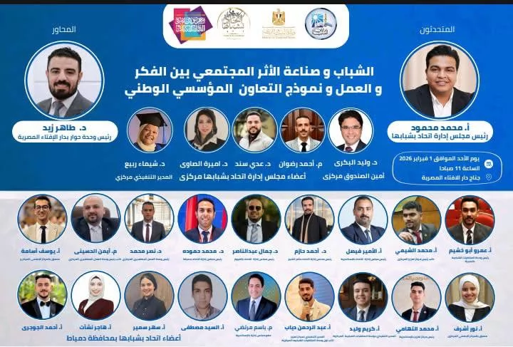 بالتعاون بين وزارة الشباب والرياضة ودار الإفتاء المصرية ينظم اتحاد بشبابها جلسة حوارية مميزة بعنوان:«الشباب وصناعة الأثر المجتمعي بين الفكر والعمل… نموذج التعاون المؤسسي الوطني».
