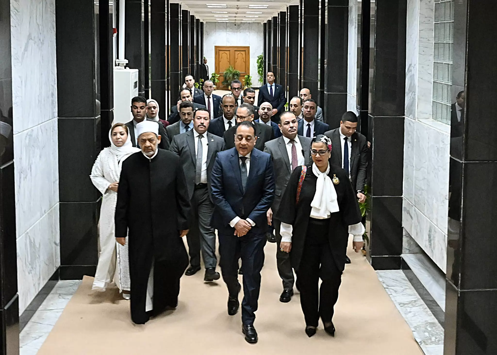 وكان في استقبال رئيس مجلس الوزراء لدى وصوله، فضيلة الإمام الأكبر، الدكتور أحمد الطيب، شيخ الأزهر الشريف، والسيدة المستشارة/ أمل عمار، رئيس المجلس القومي للمرأة، رئيس المجلس الوزاري لمنظمة تنمية المرأة.