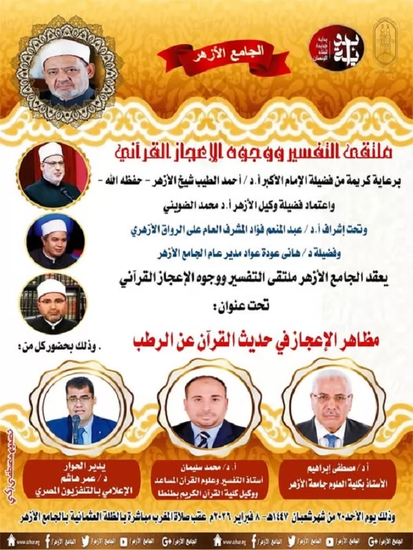 يواصل اليوم الأحد 8 فبراير 2026 م ملتقى التفسير بالجامع الأزهر لقاء التفسير الأسبوعي بعنوان "مظاهر الإعجاز في حديث القرآن عن خلق الرُطَب"