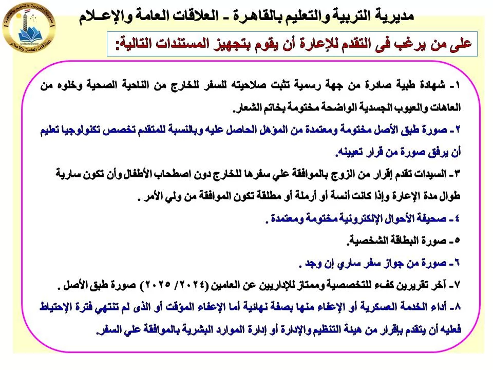 أعلنت مديرية التربية والتعليم بالقاهرة عن اقتراب موعد فتح باب التقدم للإعارات الخارجية، وفقًا للضوابط والشروط المنظمة لذلك.