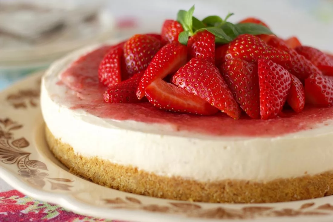 يُوزّع فوق طبقة التشيز كيك ويُزيّن بشرائح الفراولة.