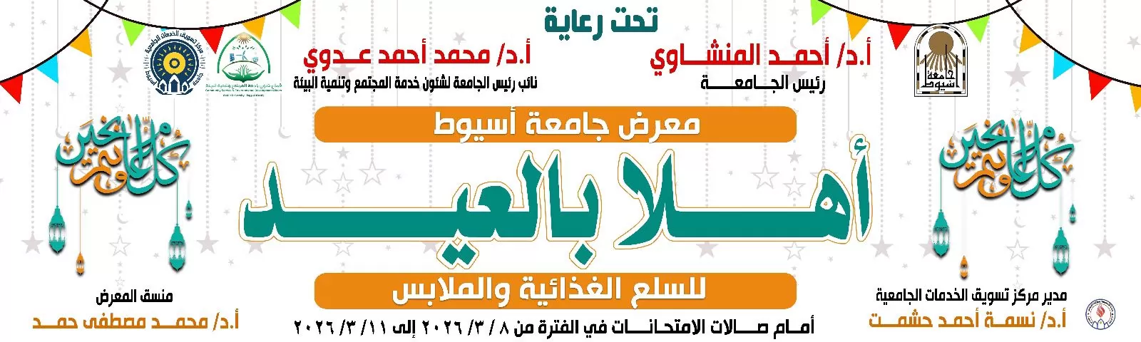 تحت رعاية الدكتور أحمد المنشاوي رئيس جامعة أسيوط، تنظم الجامعة معرض "أهلاً بالعيد" للسلع الغذائية والملابس، وذلك في إطار حرصها على دعم منتسبيها وتخفيف الأعباء المعيشية عنهم مع قرب حلول عيد الفطر المبارك، وتحت إشراف الدكتور محمد أحمد عدوي نائب رئيس الجامعة لشئون خدمة المجتمع وتنمية البيئة