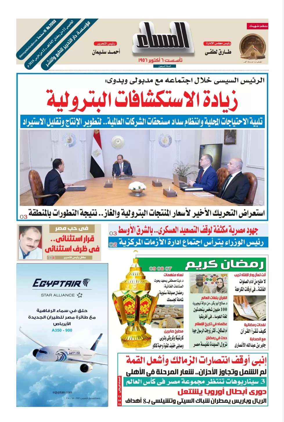 السيد الرئيس عبد الفتاح السيسى يجتمع بالدكتور مصطفى مدبولى رئيس مجلس الوزراء والمهندس كريم بدى وزير البترول والثروة المعدنية لمناقشة اخر موقف قطاع البترول والطاقة فى ظل الحرب الأمريكية الإيرانية الحالية.
