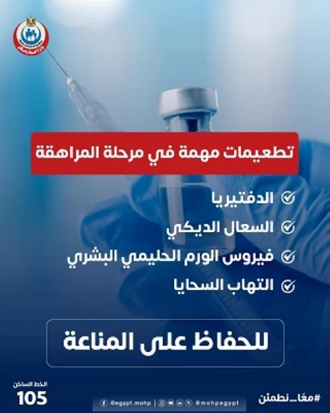 أعلنت وزارة الصحة والسكان عن أهمية الحصول على التطعيمات الأساسية في مرحلة المراهقة للوقاية من أمراض خطيرة مثل الدفتيريا والسعال الديكي وفيروس الورم الحليمي البشري والالتهاب السحائي.