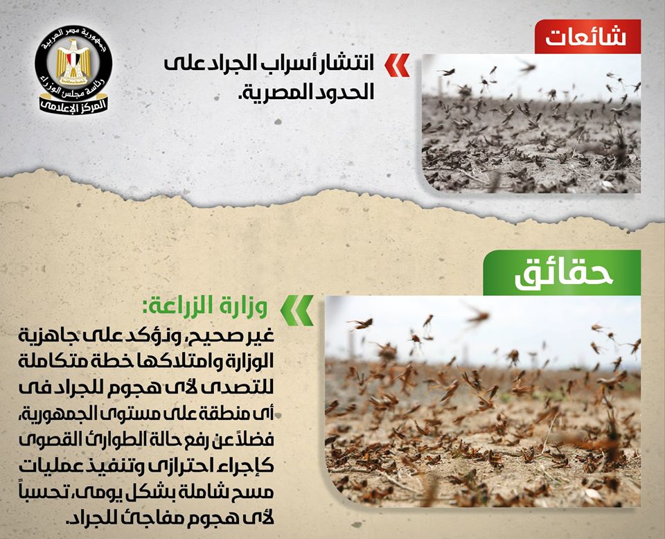 حيث تواصل المركز مع وزارة الزراعة والتى نفت ذلك تماما مؤكدة  على جاهزية الوزارة وامتلاكها خطة متكاملة للتصدي لأي هجوم للجراد في أي منطقة على مستويالجمهورية، فضلاً عن قيامها برفع حالة الطوارئ القصوى كإجراء احترازي وتنفيذ عمليات مسح شاملة بشكل يومي، تحسباً لأي هجوم مفاجئ للجراد.
