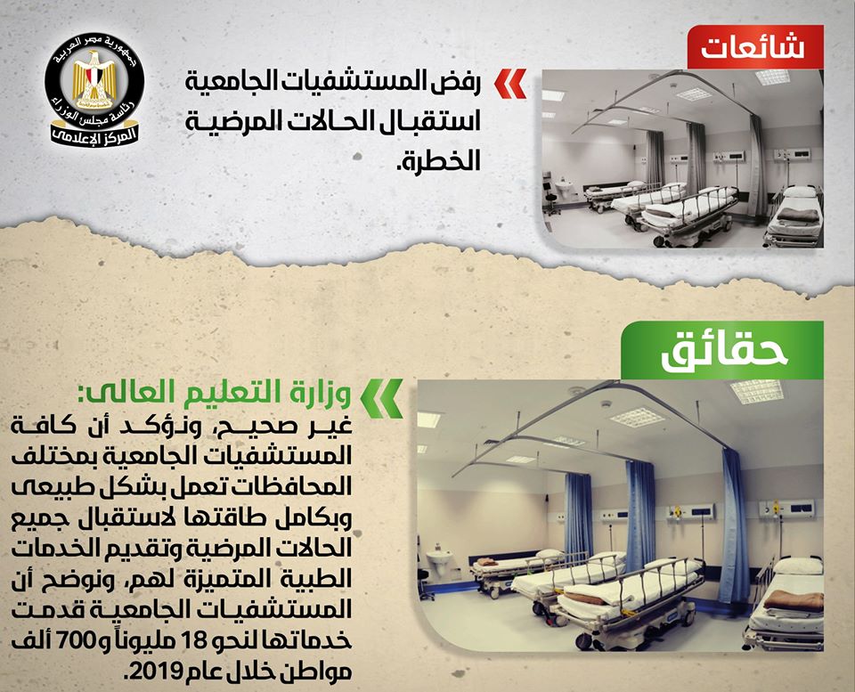 حيث نفت ذلك وزارة التعليم العالى، مؤكدة ً أن كافة المستشفيات الجامعية بمختلف المحافظات تعمل بشكل طبيعي وبكامل طاقتها لاستقبال جميع الحالات المرضية وتقديم الخدمات الطبية المتميزة لهم، مُشيرةً إلى أن المستشفيات الجامعية قدمت خدماتها لنحو 18 مليوناً و700 ألف مواطن خلال عام 2019.