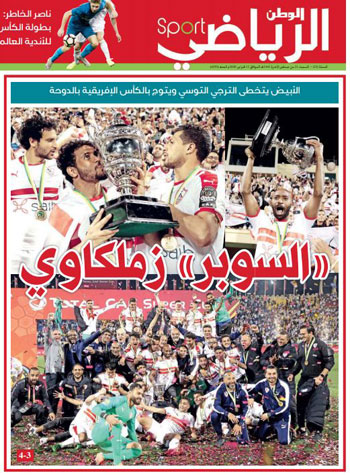 وتصدر غلاف صحيفة الشروق القطرية فريق الزمالك اثناء احتفاله بكأس السوبر الافريقية، وعنونت "سوبر.. الزمالك" وعنوان فرعى توج باللقب عقب فوزه على الترجى بلاثية فى مواجهة افريقية قوية.