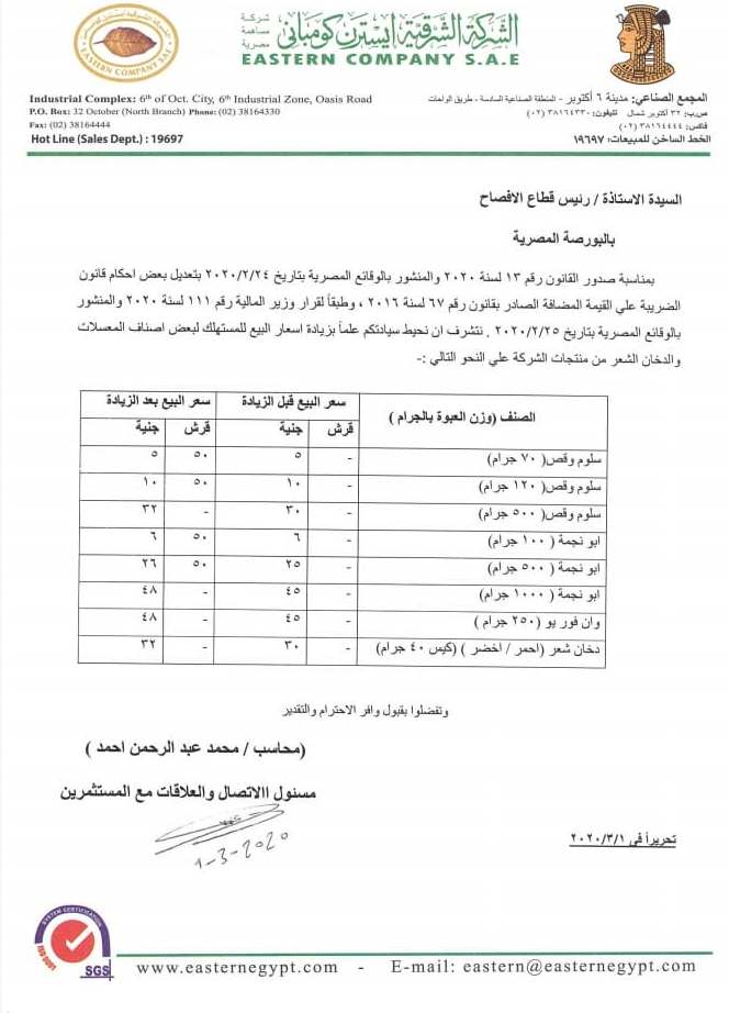 جدير بالذكر أن الشرقية للدخان أخطرت إدارة البورصة المصرية فى 26 فبراير الماضى بزيادة أسعار السجائر بقيمة جنيه واحد على مختلف الأصناف الموجودة فى السوق.