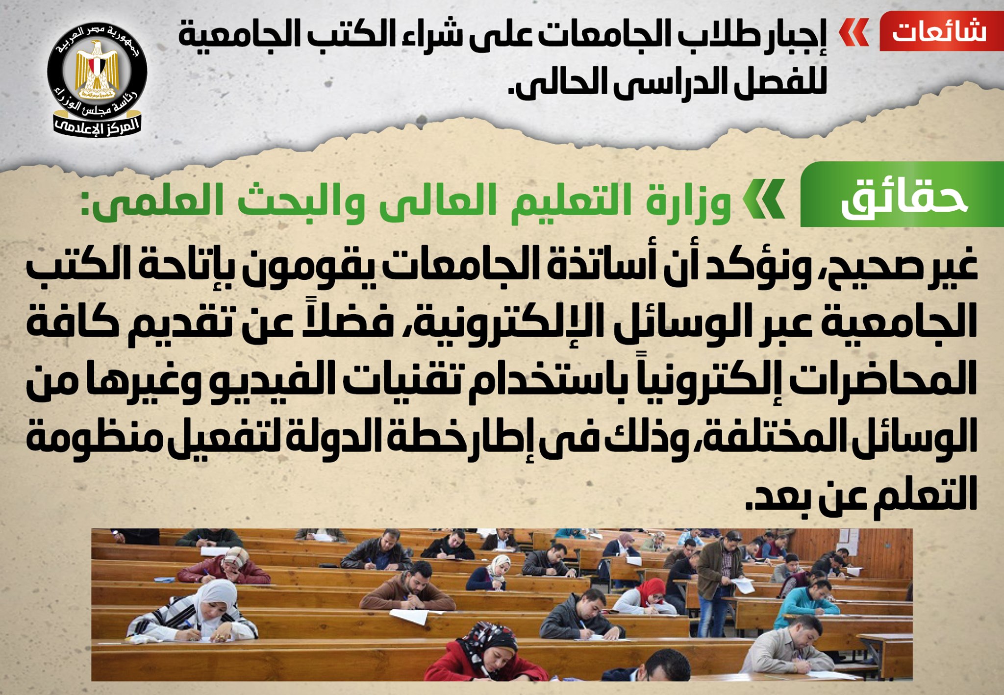 مُؤكدةً أنه لا صحة لإجبار أي من طلاب الجامعات على شراء الكتب الجامعية، مُوضحةً أن أساتذة الجامعات يقومون بإتاحة الكتب الجامعية عبر الوسائل الإلكترونية، فضلاً عن تقديم كافة المحاضرات إلكترونياً في إطار خطة الدولة لتفعيل منظومة التعلم عن بعد