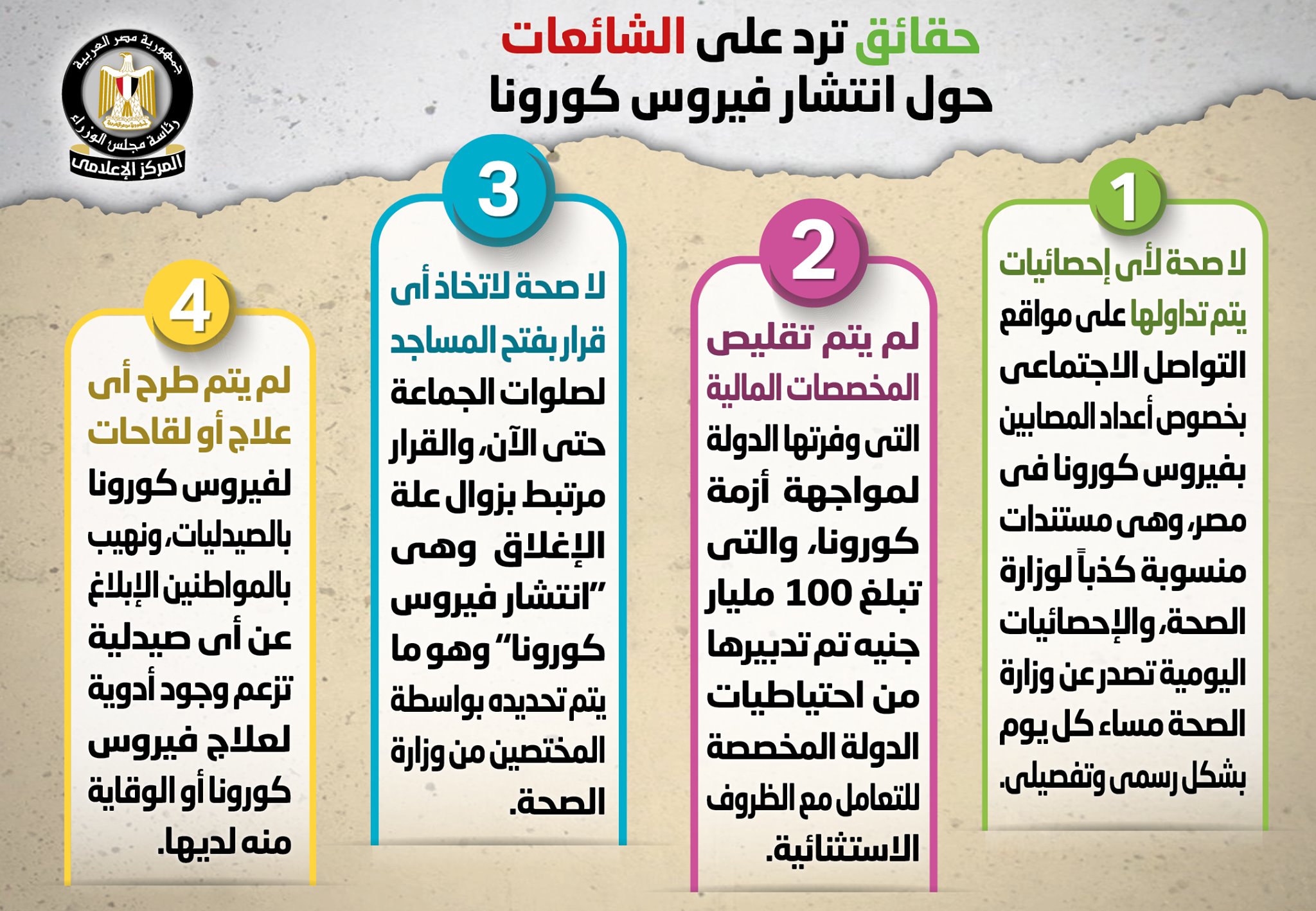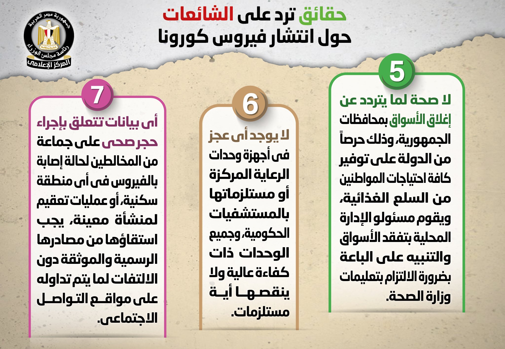 وأكدت أنه لم يتم تقليص المخصصات المالية التي وفرتها الدولة لمواجهة أزمة كورونا، والتي تبلغ 100 مليار جنيه تم تدبيرها من احتياطيات الدولة المخصصة للتعامل مع الظروف الاستثنائية وانه لا صحة لاتخاذ أي قرار بفتح المساجد لصلوات الجماعة حتى الآن، والقرار مرتبط بزوال علة الإغلاق وهي "انتشار فيروس كورونا" وهو ما يتم تحديده بواسطة المختصين من وزارة الصحة ولا صحة لما يتردد عن إغلاق الأسواق بمحافظات الجمهورية، وذلك حرصاً من الدولة على توفير كافة احتياجات المواطنين من السلع الغذائية، ويقوم مسئولو الإدارة المحلية بتفقد الأسواق والتنبيه على الباعة بضرورة الالتزام بتعليمات وزارة الصحة.