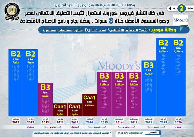 وعلى صعيد متصل، أبرز الإنفوجراف، إعلان وكالة "موديز" تثبيت التصنيف الائتماني لمصر عند B2 مع نظرة مستقبلية مستقرة وذلك في أبريل 2020 وهو المستوى الأفضل خلال 8 سنوات، محتفظاً بنفس المستوى منذ أبريل 2019، وهو نفس المستوى أيضاً الذي حققته مصر في سبتمبر 2012 مع اختلاف النظرة المستقبلية إلى سلبية، ثم تراجع في فبراير 2013 ليصل إلى مستوى (B3) بنظرة مستقبلية سلبية، وصولاً إلى أدنى مستوى له عند (Caa1) مع نظرة مستقبلية سلبية، في مارس 2013.