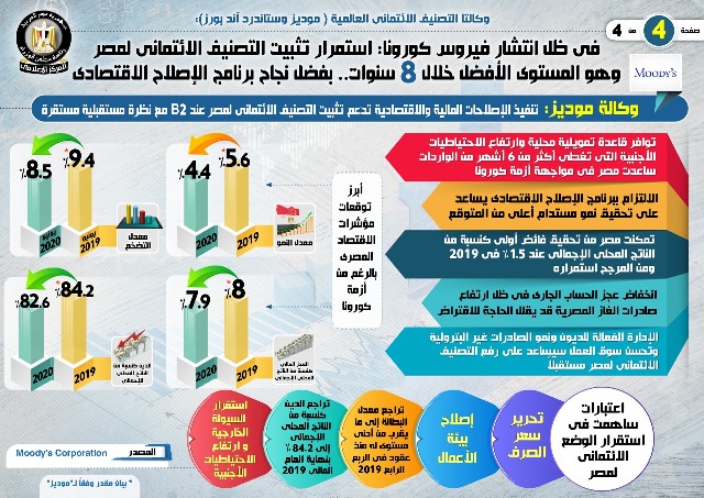 وجاء في الإنفوجراف، إعلان وكالة "ستاندرد آند بورز" تثبيت التصنيف الائتماني لمصر وإبقاءه عند مستوى (B) مع نظرة مستقبلية مستقرة، وذلك في أبريل 2020 - وهو المستوى الأفضل خلال 8 سنوات- محتفظاً بنفس المستوى منذ مايو 2018، وهو نفس المستوى أيضاً الذي حققته مصر في فبراير 2012 مع اختلاف النظرة المستقبلية إلى سلبية، واستمر بنفس المستوى حتى تراجع في ديسمبر 2012 ليصل إلى مستوى (-B) مع نظرة مستقبلية سلبية، وصولاً إلى أدنى مستوى له عند (ccc+) مع نظرة مستقبلية مستقرة، في مايو 2013.