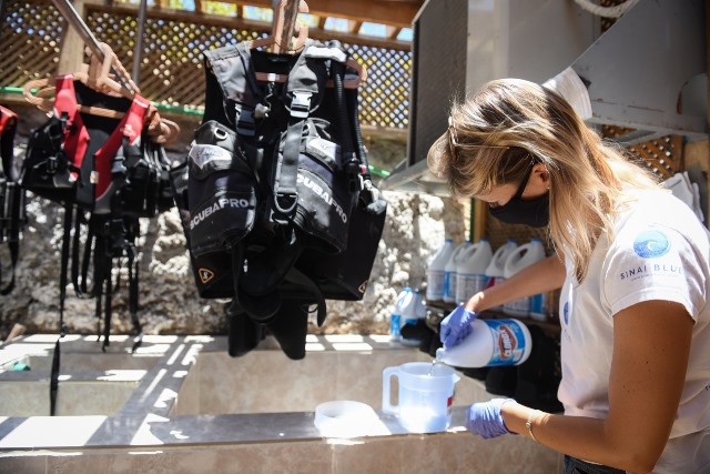 إلزام جميع العاملين بارتداء الكمامات، وإلزام العاملين فى التنظيف والمطبخ ومحطات شحن وصيانة الإسطوانات ومعدات الغوص والقائمين على تنظيف معدات الإيجار بارتداء القفازات.