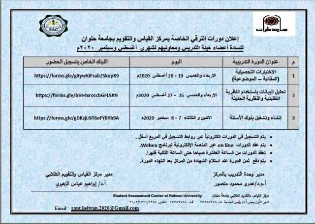 وتتضمن الدورات التدريبية المقدمة دورة التدريب على الاختبارات التحصيلية المقالية والموضوعية وفق جدول المواصفات وذلك خلال الفترة من ١٩: ٢٠ أغسطس ٢٠٢٠، وتهدف إلى التعرف على مفهوم نواتج التعلم والتقويم التربوي لاداء المتعلم، و استنتاج معايير تقويم نواتج التعلم ومؤشراتها، وتقديم نقداً لاساليب وعمليات التقويم الحالية، و اقتراح بعض التحولات الضرورية لتطوير تقويم نواتج التعلم، والتعرف على الوضع الراهن لخريجي التعليم الجامعي، و استنتاج دواعي تطوير تقويم أداء الطلاب، والتعرف على أنواع أسئلة اختيار الاستجابة ومميزاتها وعيوبها وكيفية صياغة هذه الأسئلة بمهارة وتصميم بطاقة ملاحظة لقياس كل من الجوانب العملية والوجدانية ويتم التسجيل في الدورة التدريبية عن طريق الرابط التالي: