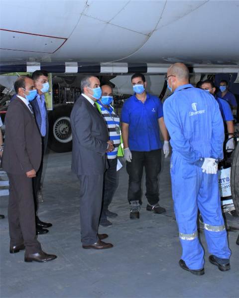 ثم توجه إلى هنجر ٨٠٠٠ ومجمع المخازن الفنية ومجمع ورش عمرة الوحدات الميكانيكية التابعين لشركة مصر للطيران للصيانة والأعمال الفنية وتفقد الطيار محمد منار سير العمل داخل الهنجر والأداء والخدمات الفنية و التكنولوجية التي تقدم للعملاء من شركات الطيران المختلفة وتابع سيادته أعمال الصيانة التي تتم لعدد من الطائرات داخل الهنجر، وأطمئن علي تطبيق كافة الإجراءات الوقائية والاحترازية للحفاظ علي سلامة وصحة العاملين ، كما وجه بضرورة الالتزام بتطبيق اعلي معايير الجودة العالمية فضلاً عن تقديم أفضل الخدمات للعملاء.