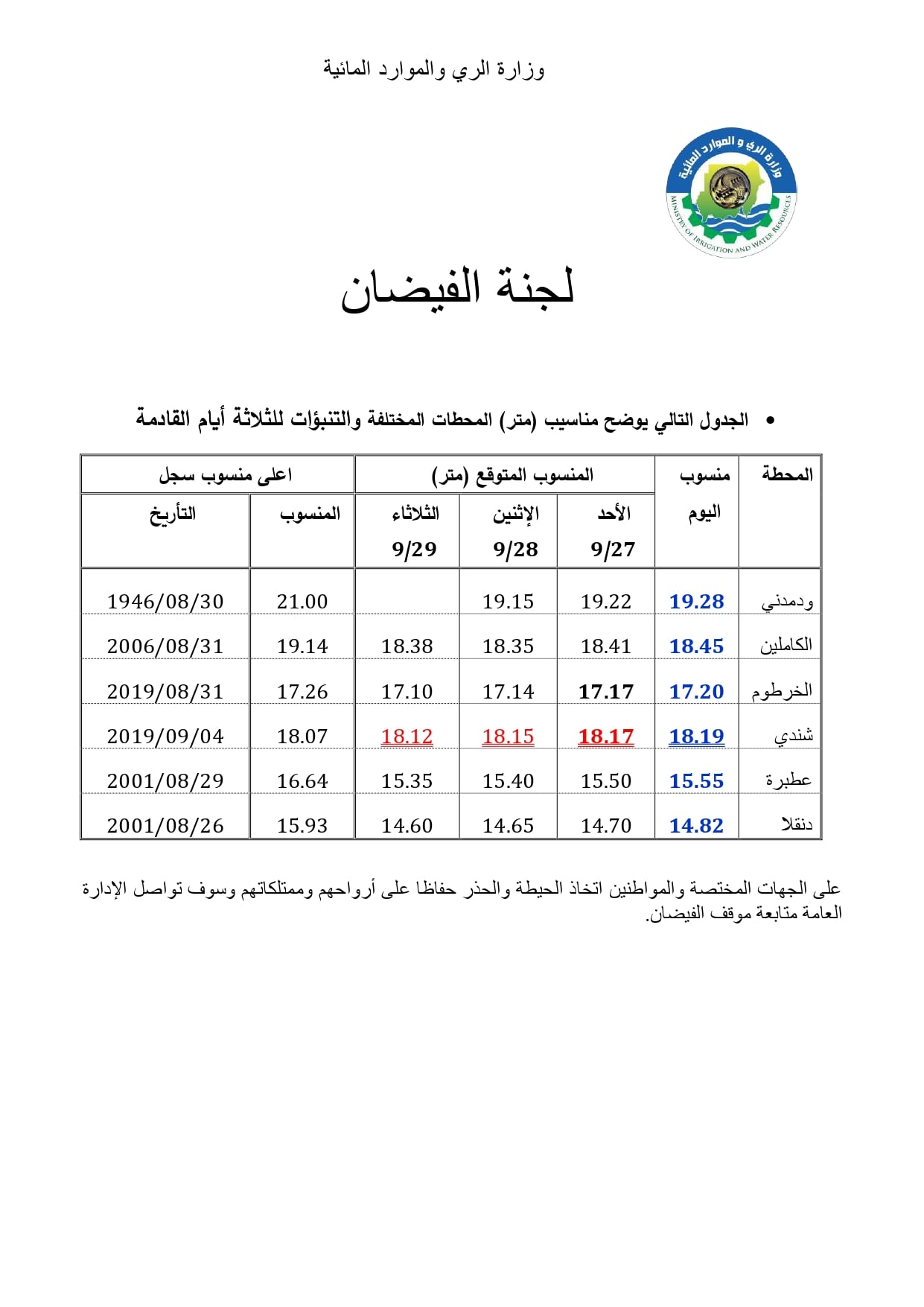وتوقعت اللجنة أن تكون المناسيب ليوم غد الأحد على النحو التالى: