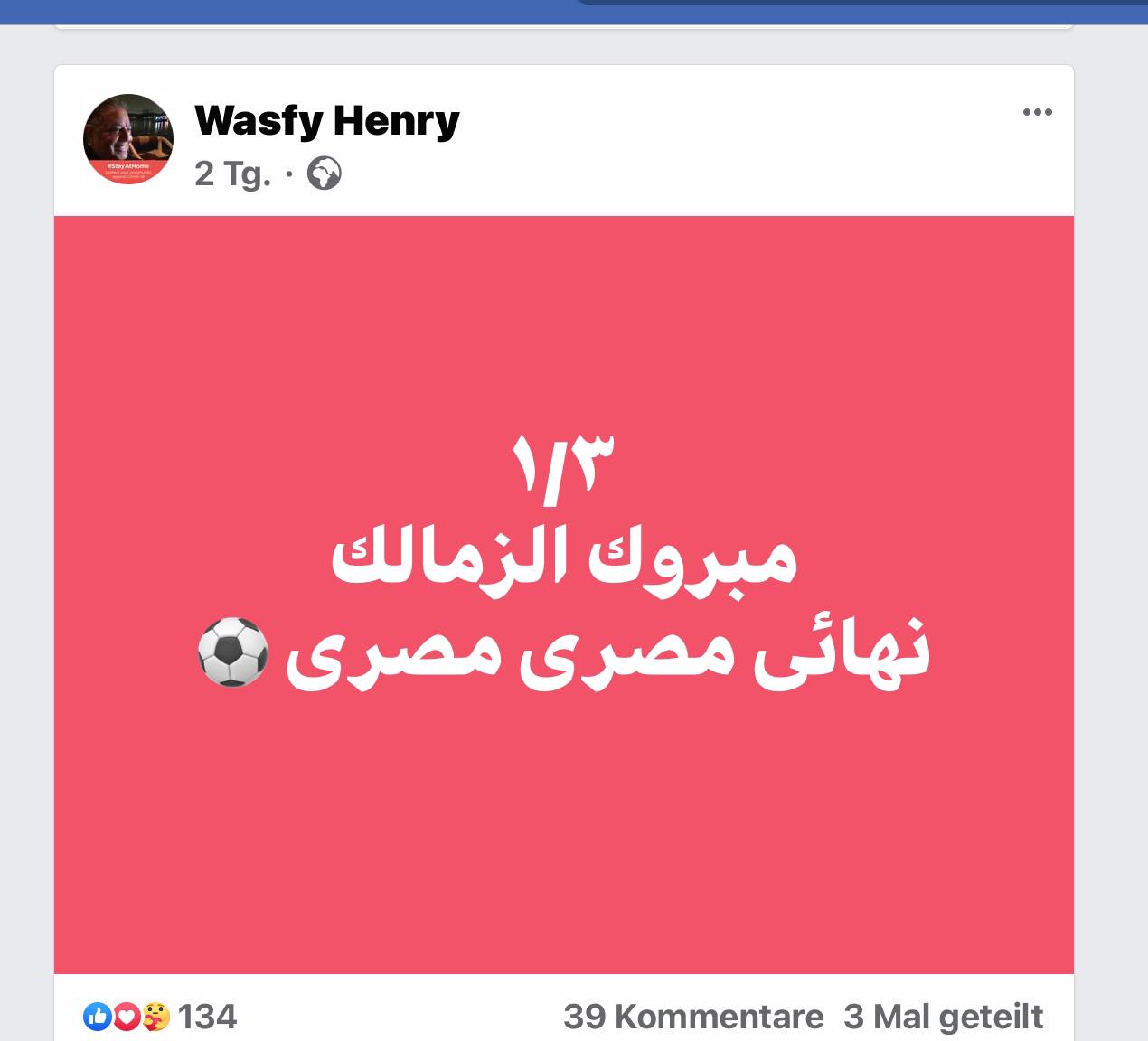 يقول وصفي هنري مغترب مصري يعيش في النمسا وصاحب قلم رشيق: أصدقائى وأحبائى .. رغم نشأتى الاهلاوية إلا اننى بادرت بتهنئة الزمالك فور فوزه على الرجاء ، فرحتى كانت عارمة ان تكون المباراة النهائية لدورى بطل ابطال افريقيا مصرية …اصبح بالنسبة لى وجود اكبر ناديين مصريين فى نهائى البطولة فرح ونصر للكرة المصرية لذلك أيا كانت نتيجة المباراة فأننى أرى انها لن تكون نصرا للأهلى أو الزمالك لكنها نصر لمصر والرياضة المصرية