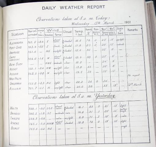 مصر تصدر حالة الطقس لدول الأورو المتوسطية في القرن الـ19 وقرأت كتيب تحليل عن حالة الطقس من عام 1892 "مصري"، مدون بخط اليد به وصف بدرجات الحرارة باللغة اليونانية، وهذا يدل أن مصر رائدة في مجال الأرصاد الجوية في هذا الحين، حيث أنها كانت تصدر تنبؤات للعديد من الدول منها (اليونان وإيطاليا وأثينا وقبرص)، بدرجات الحرارة وإتجاهات وسرعة الرياح وكميات السحب، وذلك جاء نتيجة التقدم الذي توصلت إليه مصر في هذا الوقت .