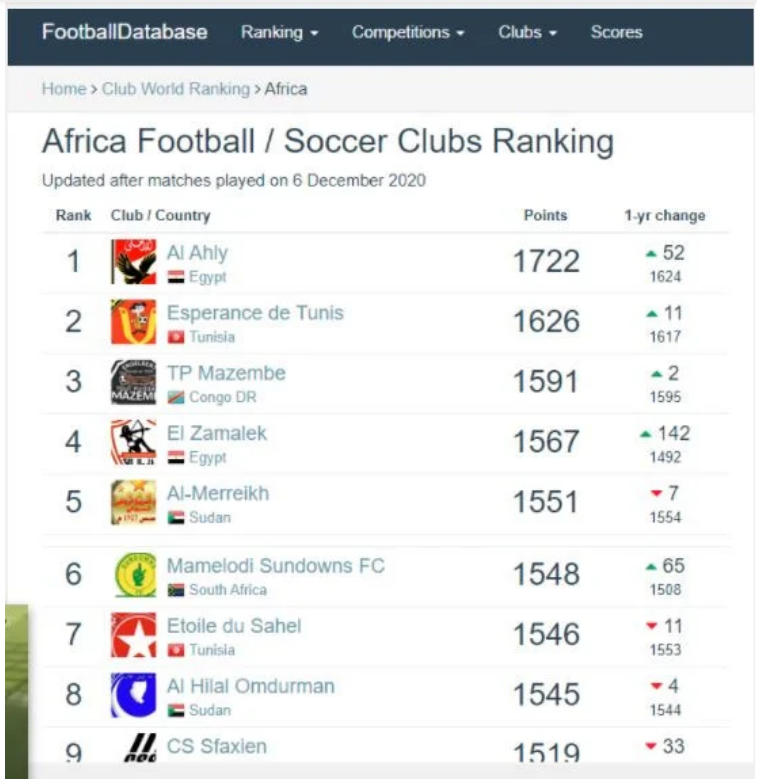تصدر النادي الأهلي ترتيب الاندية الافريقية, وجاء فى المركز 38 عالمياً، وواصل تفوقه على العديد من الأندية العالمية فى تصنيف الأندية الذى صدر عن أحد المواقع المتخصصة مؤخرا, بعد حصده بطولتين في أسبوع واحد، بحسم لقب دوري أبطال أفريقيا وكأس مصر، وتحقيق الثلاثية التاريخية.