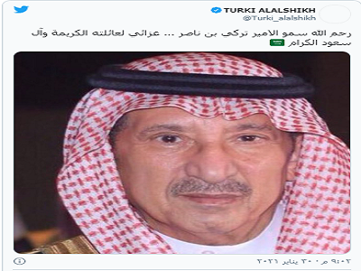 ونعى الأمير تركي بن ناصر، رئيس مجلس إدارة الهيئة العامة للترفيه السعودية، تركي آل الشيخ، قائلا في تغريدة عبر حسابه الرسمي على "تويتر":